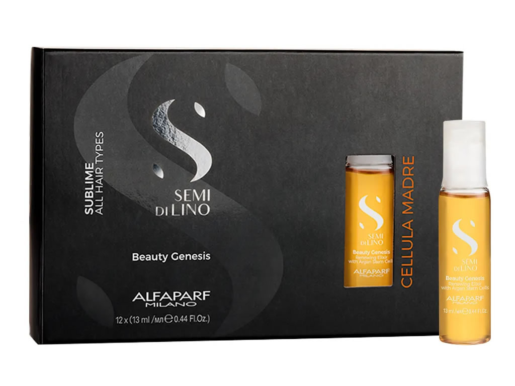 Caixa de Ampola para Brilho Alfaparf Milano Professional Semi Di Lino Beauty Genesis renovador com células estaminais vegetais de Argan, com a particular capacidade de se autorrenovarem continuamente, para cabelos sublimes, com um aspecto luminoso e saudável.
