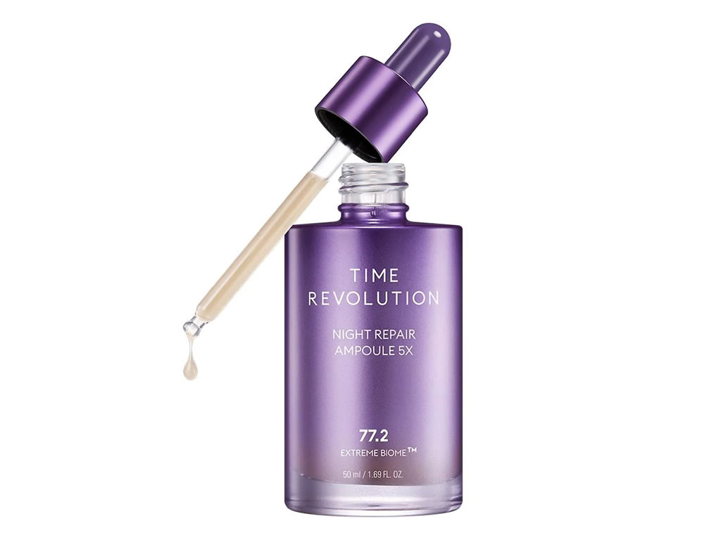 A ampola de reparo noturno Time Revolution 5X é o tratamento probiótico noturno líder de quinta geração da marca Missha.