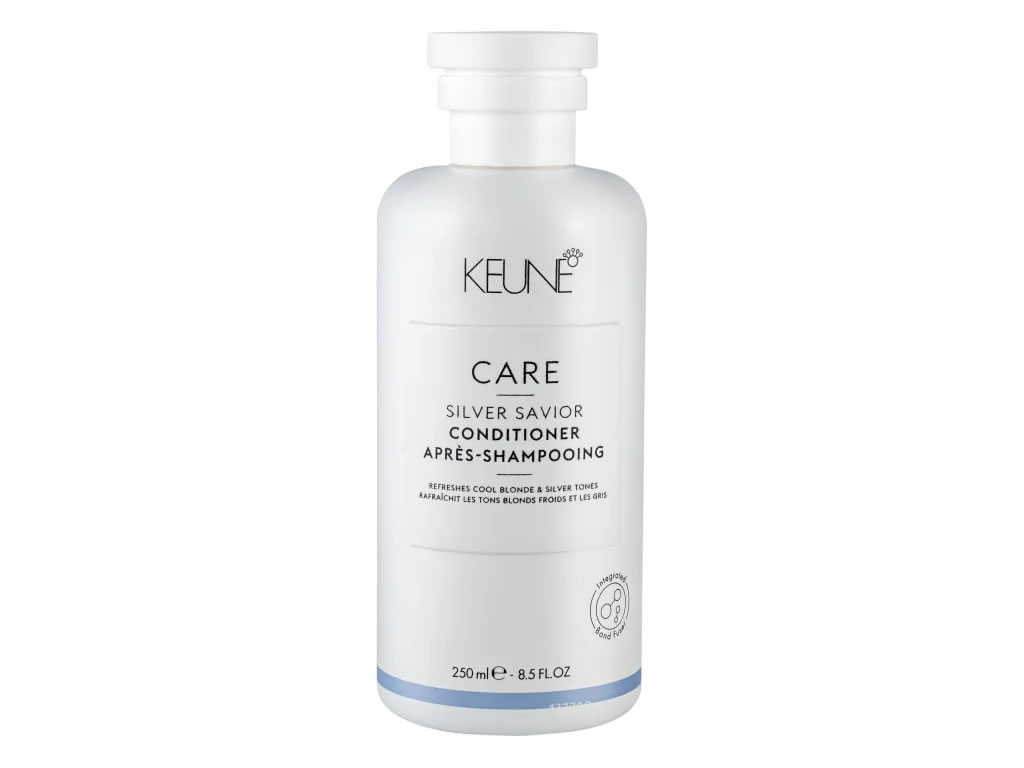 Condicionador desamarelador para cabelos loiros, com mechas ou grisalhos. Keune Care Silver Savior Conditioner ajuda na neutralização da cor ao reduzir os tons quentes enquanto facilita o pentear.