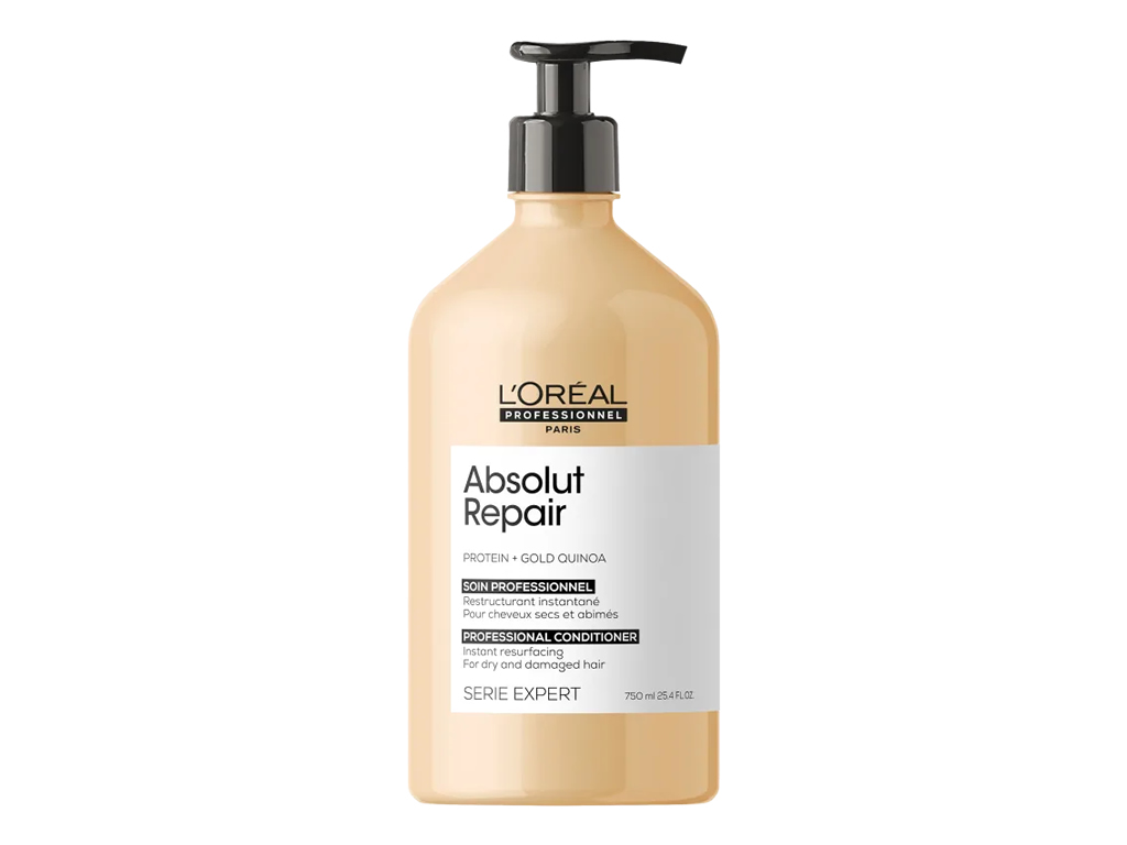 Condicionador para cabelos danificados. L'Oréal Professionnel Serie Expert Absolut Repair Gold Quinoa + Protein desembaraça e reestrutura a superfície do fio para mais brilho e leveza.