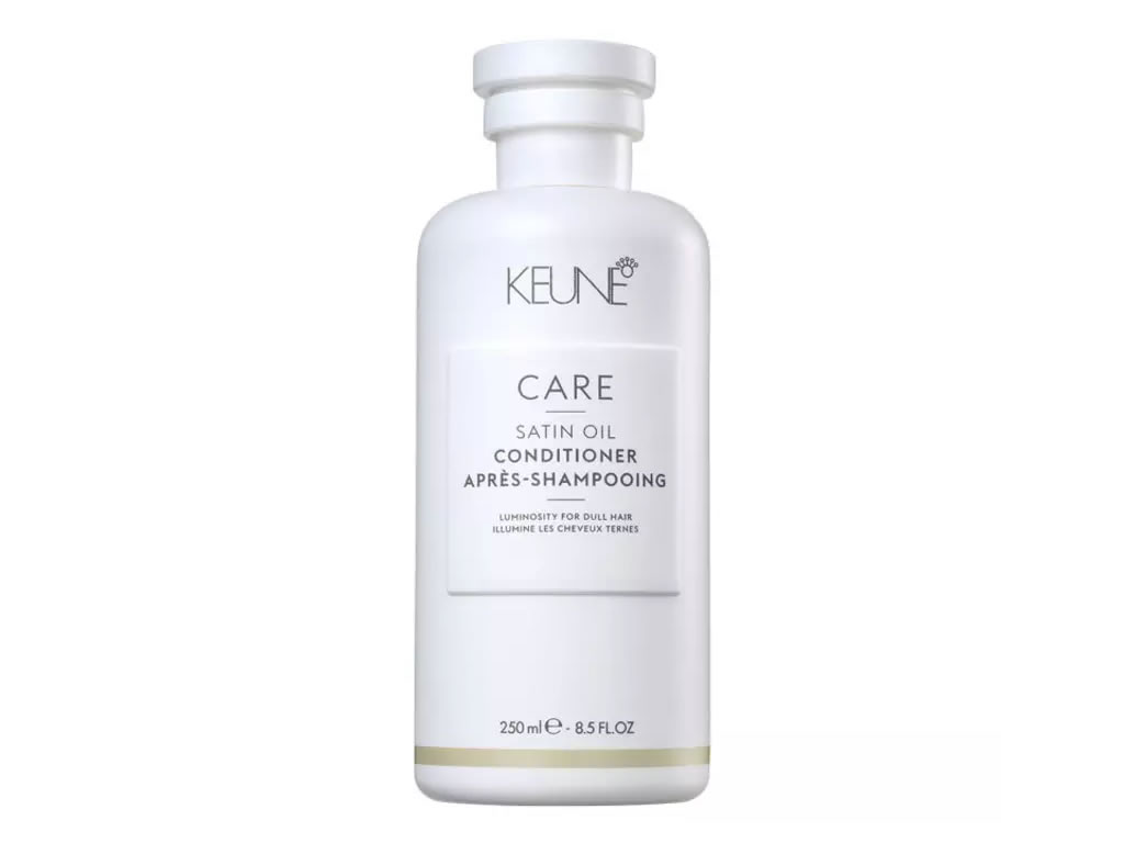 Condicionador para cabelos secos e opacos. Condicionador Keune Satin Oil hidrata profundamente os fios e deixa o cabelo macio e brilhante.