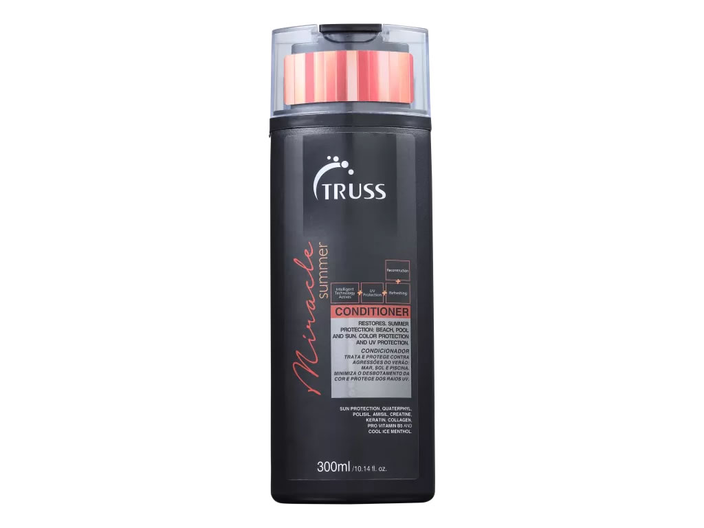 Condicionador para cabelos expostos ao sol, mar, cloro da piscina ou vento. Truss Miracle Summer Conditioner hidrata e protege os fios das agressões intensificadas pelo verão.