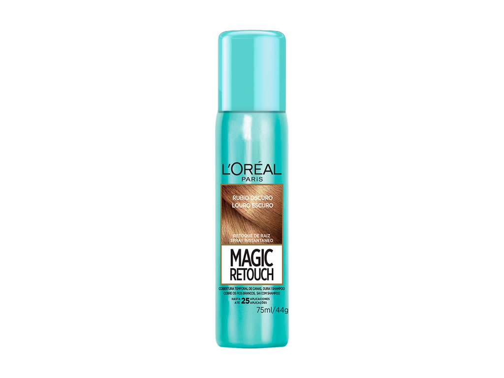 O corretivo instantâneo Magic Retouch de L’Oréal Paris possui 75 ml, é uma maquiagem para cabelo, retoque de raiz, spray instantâneo e cobre temporariamente os fios. Sai com shampoo, dura até 25 aplicações, retoca a raiz e é um spray instantâneo.