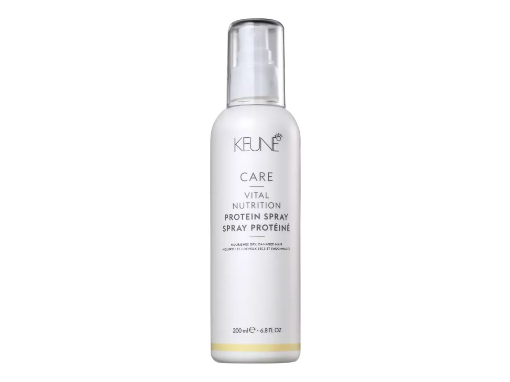 Spray condicionante para cabelos secos e danificados. Keune Care Vital Nutrition Protein protege fios e couro cabeludo nos processos químicos.