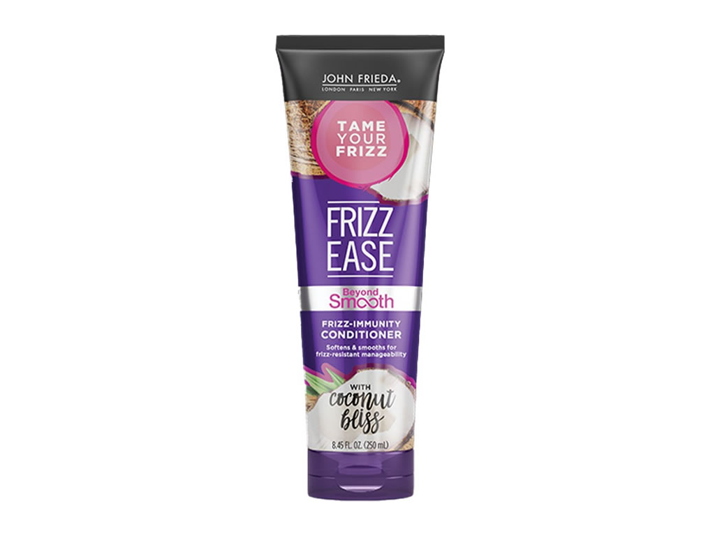 Condicionador para cabelos com frizz e indisciplinados. John Frieda Frizz Ease Beyond Smooth Frizz-Immunity desembaraça e amacia os fios de dentro para fora com fechamento das cutículas, efeito liso duradouro, brilho e sedosidade intensos.