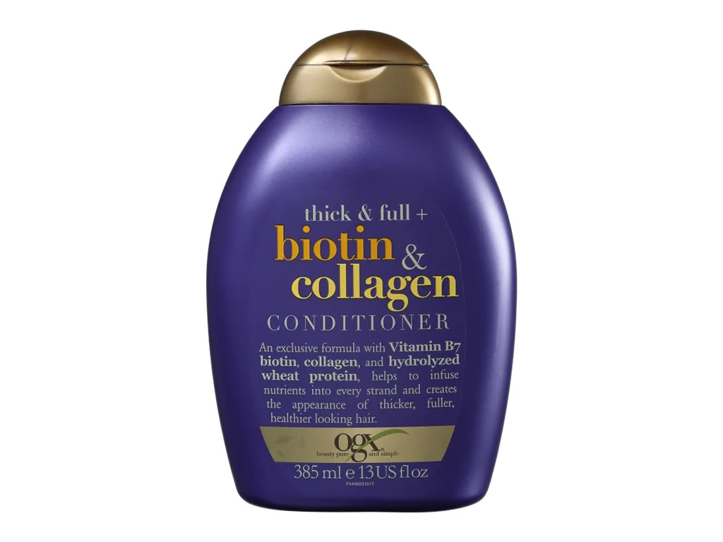 O Condicionador OGX Biotin & Collagen conta com uma fórmula enriquecida com nutrientes que penetram no interior da fibra capilar. Proporciona um aspecto mais volumoso e encorpado aos fios.