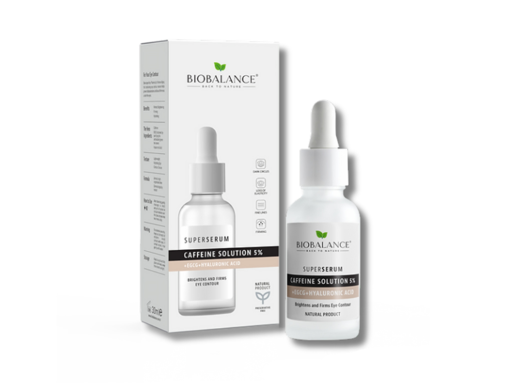 BioBalance Caffeine Solution 5% + EGCG + Hyaluronic Acid Serum é um tratamento especialmente formulado para áreas sensíveis sob os olhos