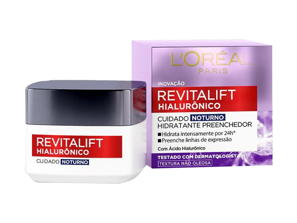 Anti-idade para todos os tipos de pele. L'Oréal Paris Revitalift Hialurônico Cuidado Noturno preenche as linhas de expressão e hidrata intensamente.