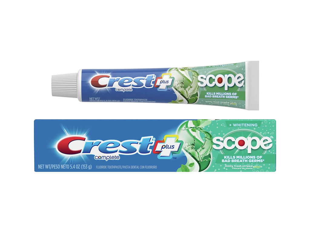 O creme dental branqueador completo Crest + Scope tem os benefícios do creme dental Crest com a adição do frescor Scope.