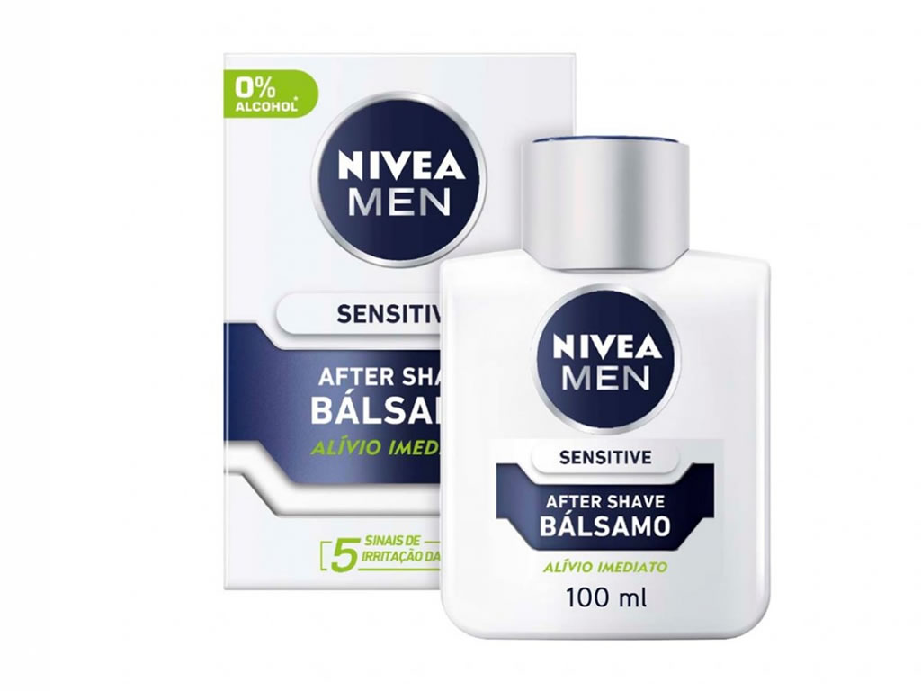 Nivea Men Sensitive After Shave Balm contém camomila e vitamina E para aliviar a irritação da pele delicada recentemente raspada.