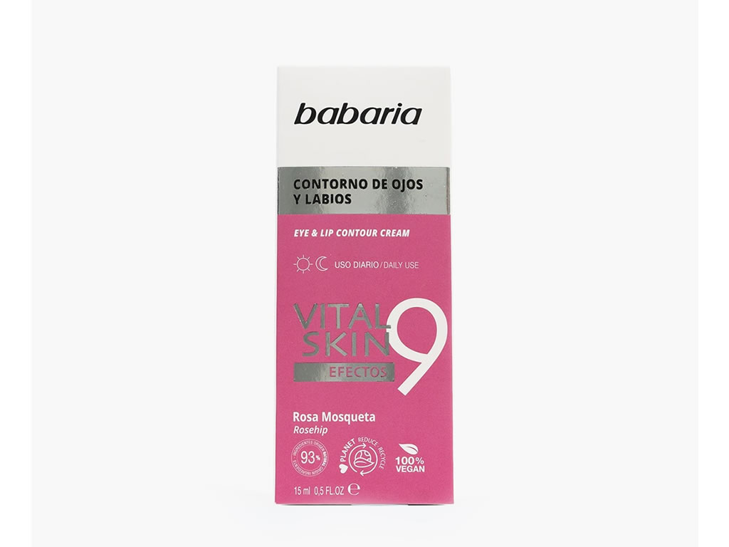 Com os 9 efeitos do Contorno de olhos e lábios Vital Skin da Babaria você terá um tratamento antienvelhecimento, redução dos pés de galinha, redução de rugas, suavização de linhas de expressão, aumento da elasticidade, maciez, uniformização do tom, antiradicais livres e aumento da longevidade celular. .