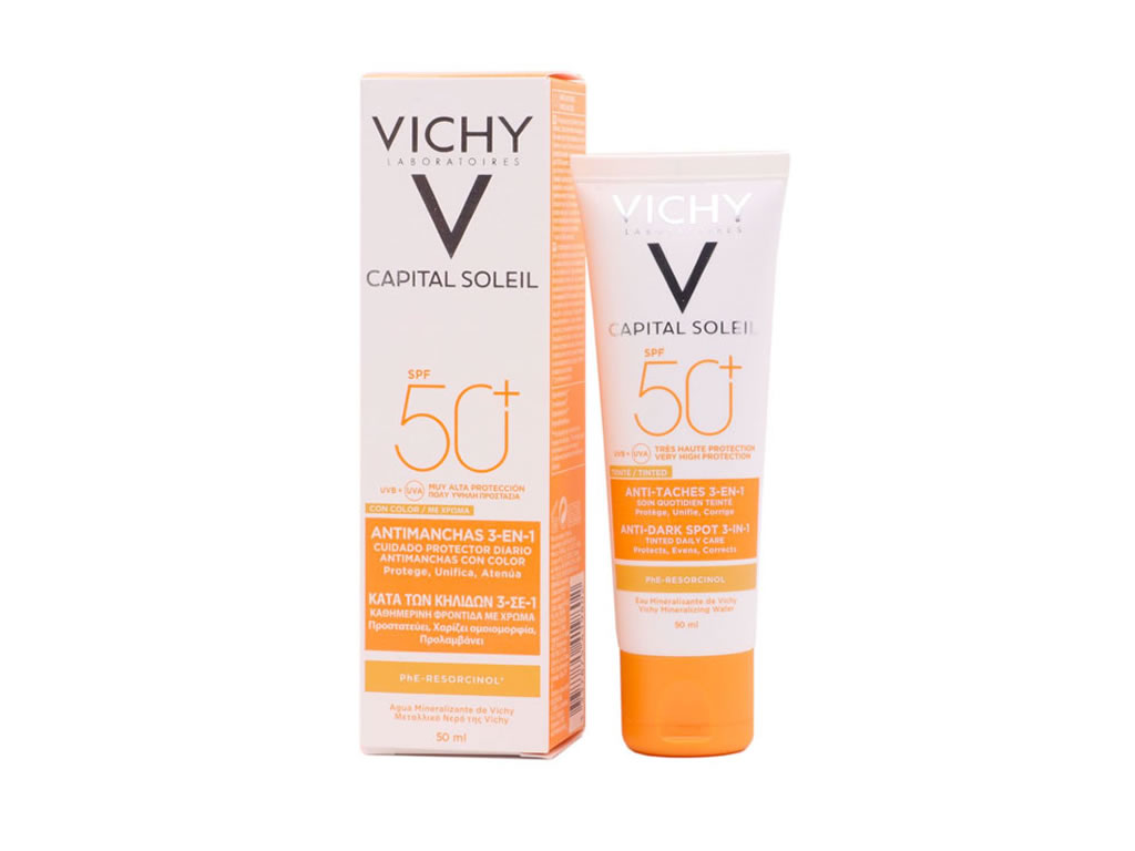 O tratamento corretivo anti-manchas Capital Soleil com FPS 50+ é um creme solar facial com tonalidade anti-manchas que uniformiza o tom da pele.