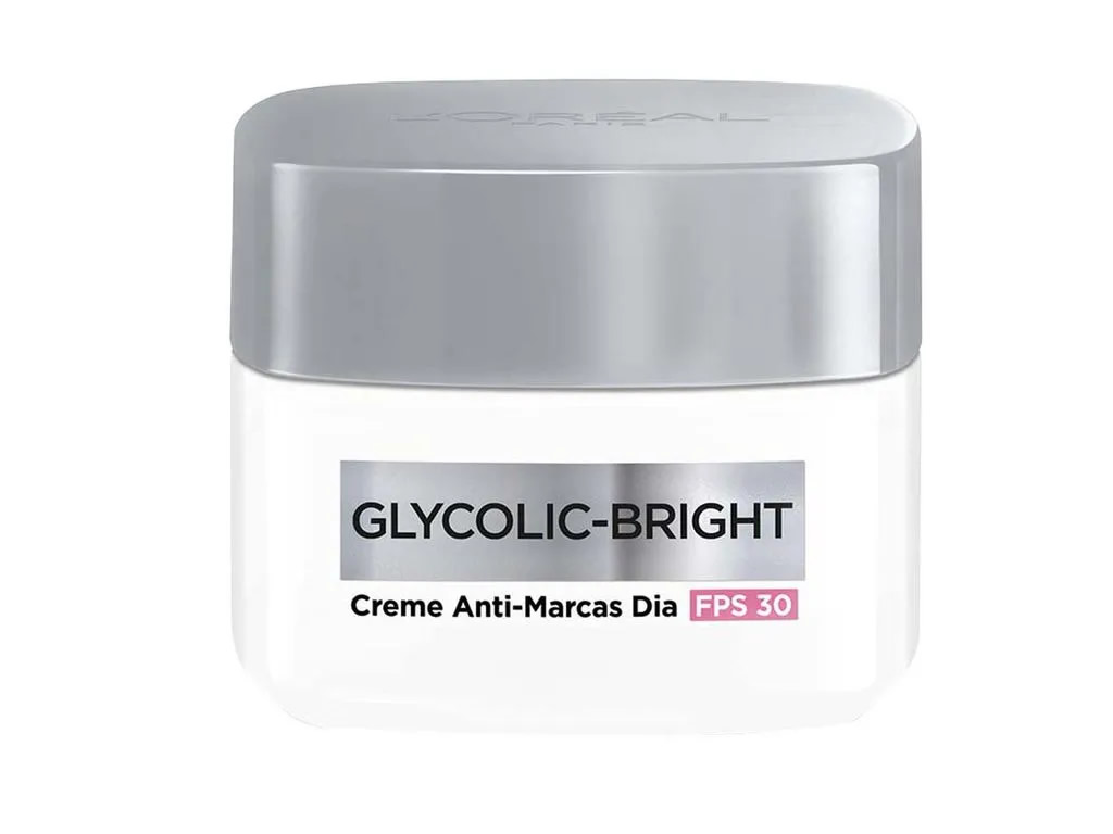 Uma fórmula poderosa desenvolvida para o uso diurno com dupla ação anti-marcas Gel Creme Facial Anti Marcas L'Oréal Paris Glycolic Bright Dia FPS30: reduz visivelmente marcas existentes + previne o aparecimento de novas marcas com FPS 30.