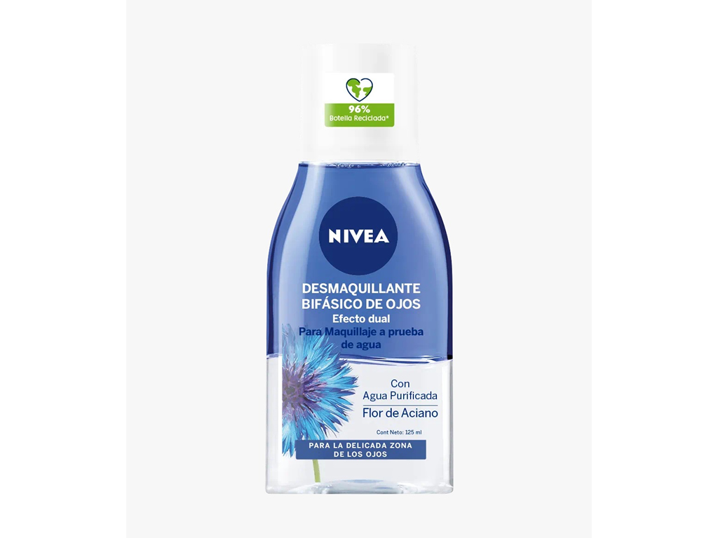 O Removedor Bifásico de Maquiagem para Olhos de Dupla Ação NIVEA remove com eficácia resíduos de maquiagem, até mesmo maquiagem à prova d'água, sem esforço. A sua fórmula bifásica enriquecida com Flor de Centáurea, limpa eficazmente a zona do contorno dos olhos e ao mesmo tempo cuida das pestanas. Limpa profundamente a área do contorno dos olhos com suavidade e eficiência. Frasco produzido com 96% de material reciclado (exceto tampa e rótulo). Compatibilidade com a pele comprovada dermatologicamente e oftalmologicamente, não contém perfume.