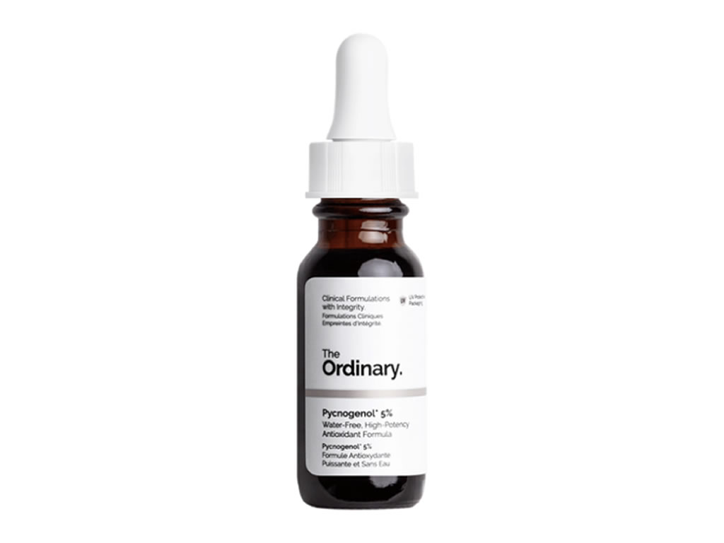 Pycnogenol® é um extrato vegetal natural derivado da casca de pinheiro de pinheiros marítimos franceses. Contém procianidinas, bioflavonóides e ácidos orgânicos que atuam em sinergia para rejuvenescer a pele, com o objetivo de aumentar a hidratação e elasticidade da pele. Com a capacidade de se ligar seletivamente ao colágeno e à elastina, Pycnogenol® protege essas proteínas da degradação, ajudando a nutrir a pele de dentro para fora. Sendo um antioxidante único e poderoso, Pycnogenol® elimina os radicais livres antes que eles causem danos pelo estresse oxidativo. Também pode reciclar a vitamina C oxidada para restaurar sua atividade. O Ordinary Pycnogenol® 5% não contém corantes artificiais. A cor vermelha profunda da fórmula se deve ao alto teor de procianidinas em Pycnogenol®. Após a aplicação,