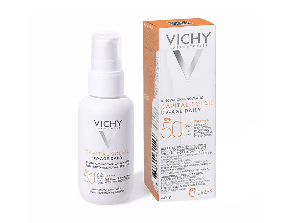 Vichy Capital Soleil UV Age Daily protetor solar Facial FPS60 Sem Cor 40gVichy Capital Soleil UV Age Daily Protetor Solar Facial FPS60 Sem Cor 40g é um protetor anti-idade 3 em 1 aqua-fluido toque seco e oil-free/não oleoso. Formulado com a patenteada tecnologia de proteção NETLOCK, que forma uma rede de proteção solar uniforme, resistente e com uma textura leve e ultra fluida. Desenvolvido para a pele brasileira, sua fórmula contém peptídeos pró-colágeno e frações probióticas para uma ação anti-idade, deixando sua pele visivelmente mais firme, preenchida e revitalizada. E além disso, previne contra rugas e manchas solares, contando com vitamina B3 conhecida por ajudar a uniformizar o tom da pele, atuando nos sinais do fotoenvelhecimento, com eficácia comprovada na redução da intensidade de diferença de tom.