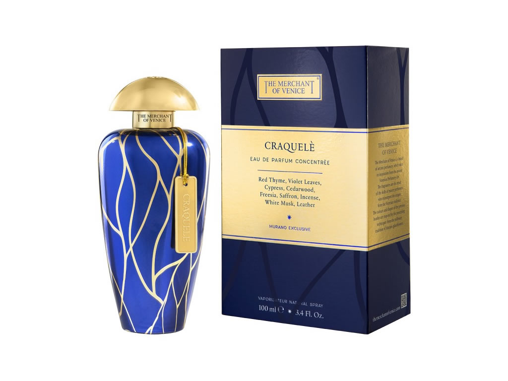 O perfume Craquele está contido em um elegante frasco feito nas típicas cores azul e dourado veneziano. Azul e dourado reinterpretam a forma mais clássica do design do vidro de Murano. Seu padrão característico de linhas curvas sinuosas inspira-se no estilo artístico da tradição da fabricação de vidro de Murano. Linhas douradas quebram o fundo azul intenso, criando um motivo suntuoso que dá a impressão de uma composição artística reconstruída. É ainda embelezado por uma taça dourada que representa a rosa dos ventos e um rótulo de metal dourado com o nome da fragrância pendurado no gargalo.