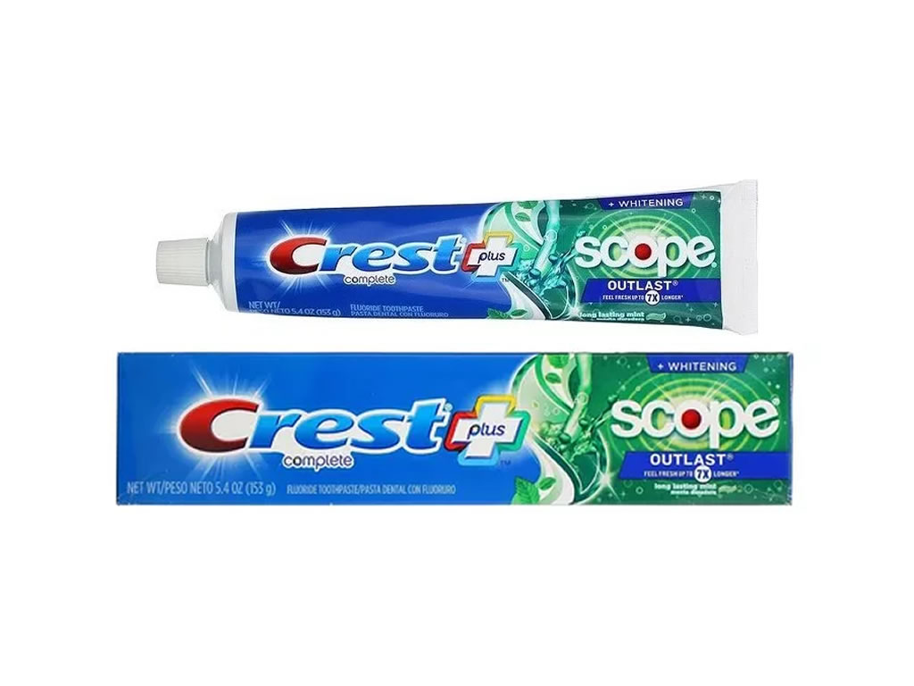 A pasta de dente tem os benefícios da pasta de dente Crest com a adição do frescor Scope.