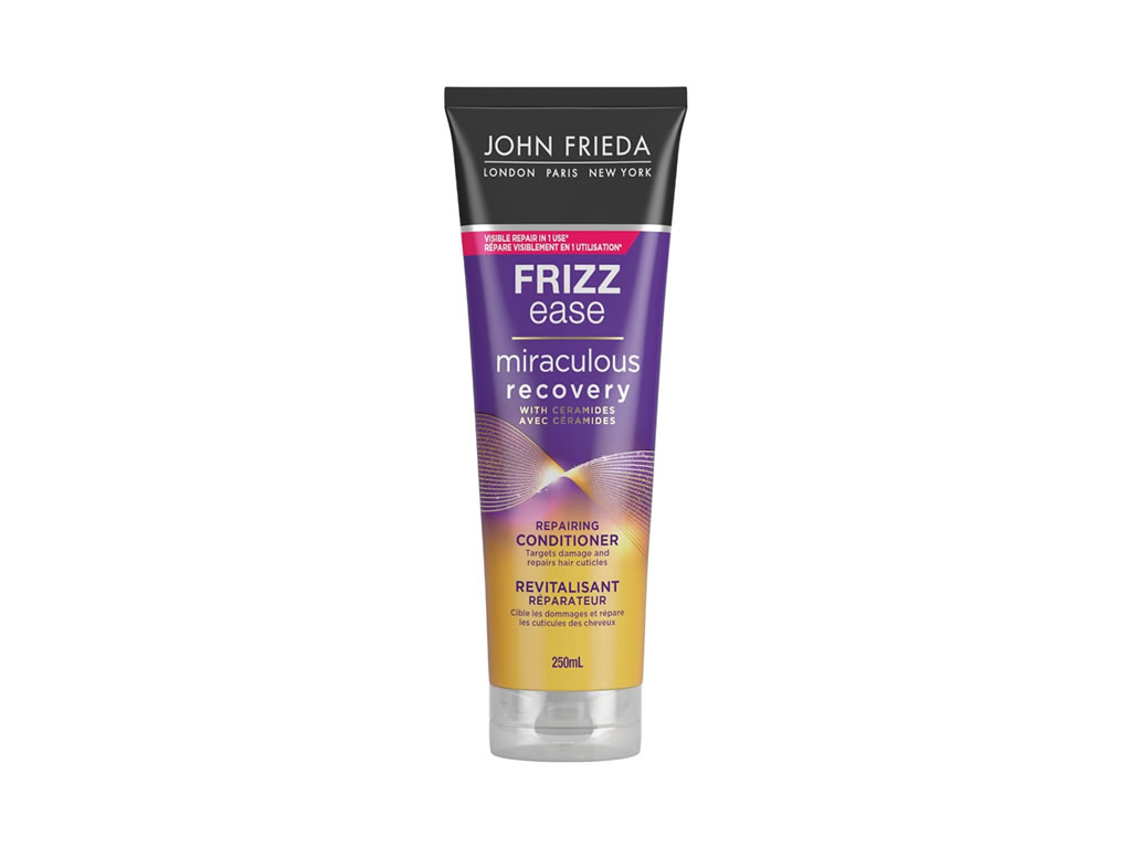 Condicionador para cabelos secos e danificados. John Frieda Frizz Ease Miraculous Recovery Repairing Conditioner restaura a hidratação, combate o ressecamento e o efeito arrepiado para fios macios e comportados.
