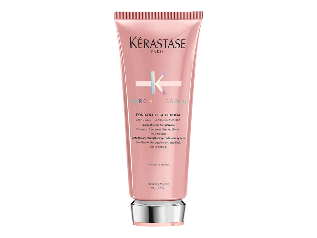 Condicionador para cabelos com coloração, sensibilizados ou danificados para fios fios a médios. Kérastase Chroma Absolu Fondant Cica promove efeito anti-porosidade e um potente fortalecedor.