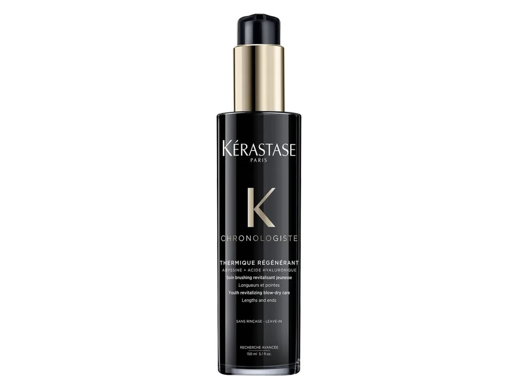 Leave-In regenerador para todos os tipos de cabelos. Kérastase Chronologiste Thermique Régénérant revitaliza e suaviza a textura da fibra capilar, protege os fios do calor de até 230°C e controla o frizz por até 24 horas.