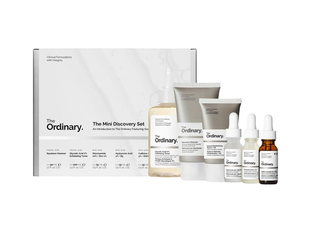 Este conjunto é o lugar ideal para começar com a The Ordinary. Ele apresenta tamanhos miniatura de algumas de suas formulações mais populares para um regime completo de cuidados com a pele. O conjunto inclui um limpador, tônico esfoliante, séruns faciais, um sérum para os olhos e um hidratante, que podem ser usados juntos em um regime diário.