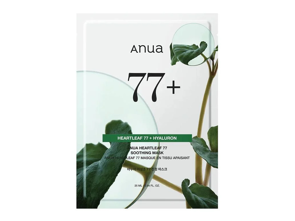 Máscara de sérum calmante hialurônico Anua Heartleaf +77 é uma máscara facial calmante e hidratante formulada para repor a umidade e acalmar a pele cansada e irritada. Infundido com 77% Extrato de folha de coração, conhecido por suas propriedades antiinflamatórias e calmantes, e Ácido Hialurônico para hidratação profunda, deixa a pele macia, rechonchuda e revigorada.