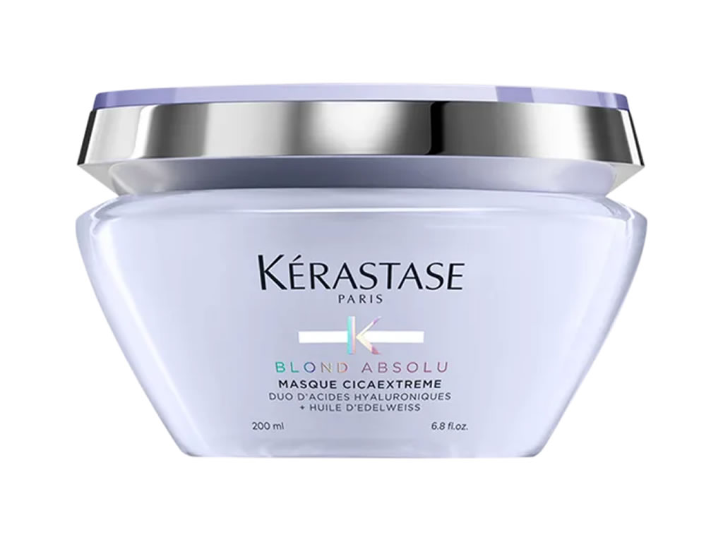Kérastase Blond Absolu Masque Cicaextreme traz fórmula enriquecida com duo de ácido hialurônico e óleo de edelweiss, que proporcionam um tratamento profundo para reconstruir o cabelo após a descoloração, tornando a fibra capilar mais uniforme e saudável.