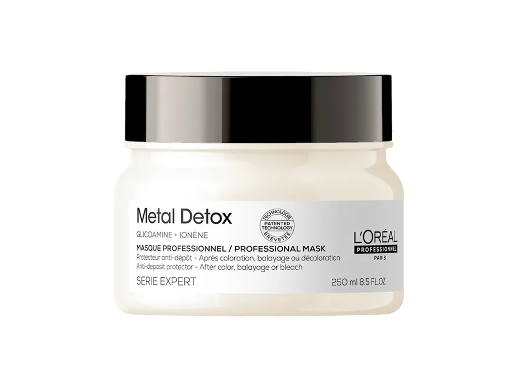 A Máscara Metal Detox, de L'Oréal Professionnel, possui tecnologia patenteada, enriquecida com Glicoamina, a molécula que rastreia e neutraliza o metal dentro da fibra capilar. Com fórmula profundamente nutritiva, proporciona um cabelo menos poroso e um tratamento para maciez, brilho e sedosidade, maior durabilidade da cor, com textura rica e cremosa.