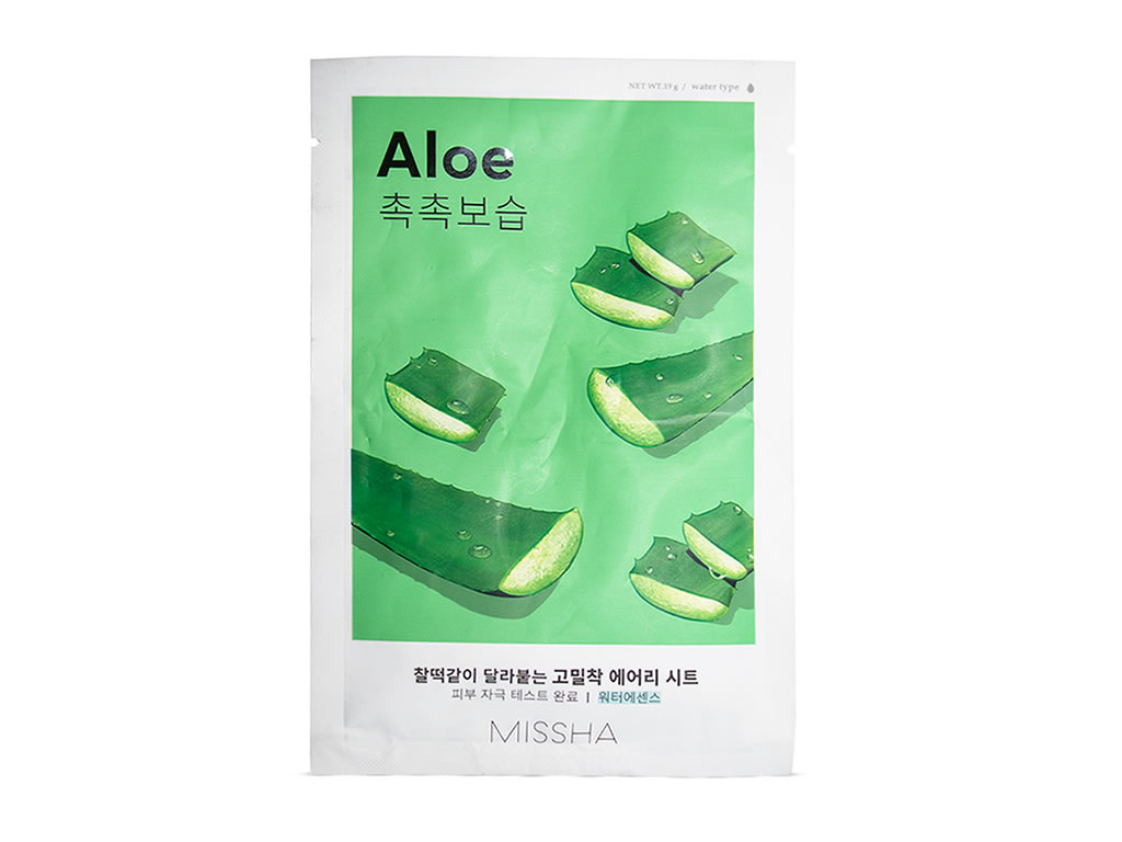 Missha Airy Fit Sheet Mask Aloe é uma máscara tipo água que ajuda a pele seca a reter a umidade. Com infusão de Aloe Vera, esta máscara forma uma película sobre a pele para manter seu nível ideal de hidratação. Ele também oferece benefícios calmantes, que são particularmente adequados para peles sensíveis. Os princípios ativos da fórmula são mantidos em seu estado mais natural, devido ao método de extração da cerveja a frio; isto permite-lhes manter a sua frescura original e transmiti-la à sua pele com grande segurança e eficácia.