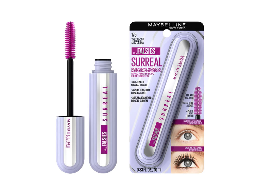 A máscara de cílios Maybelline Falsies Surreal Extensions proporciona volume e comprimento semelhantes às extensões de cílios, graças à sua tecnologia de fibra híbrida, que oferece 36% mais de comprimento e uma duração de até 24 horas.