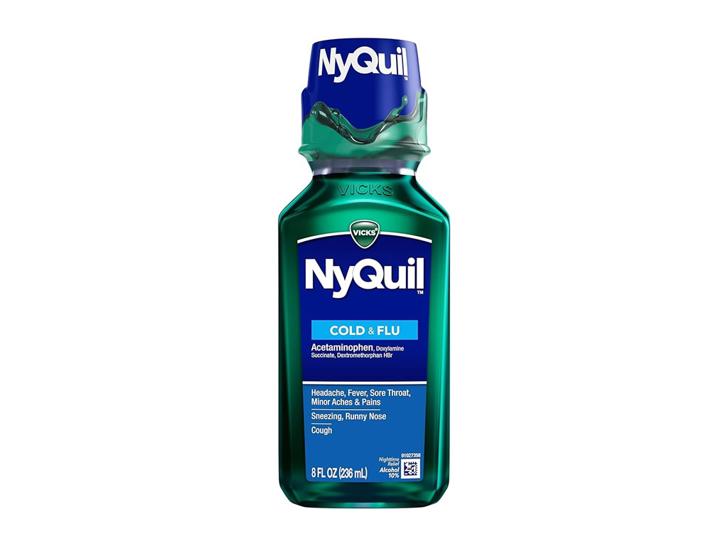 Quando você estiver resfriado, recorra ao medicamento líquido Vicks NyQuil Cold & Flu Nighttime Relief para aliviar espirros, dor de garganta, dor de cabeça, pequenas dores, febre, coriza e tosse para ajudá-lo a descansar o que precisa.