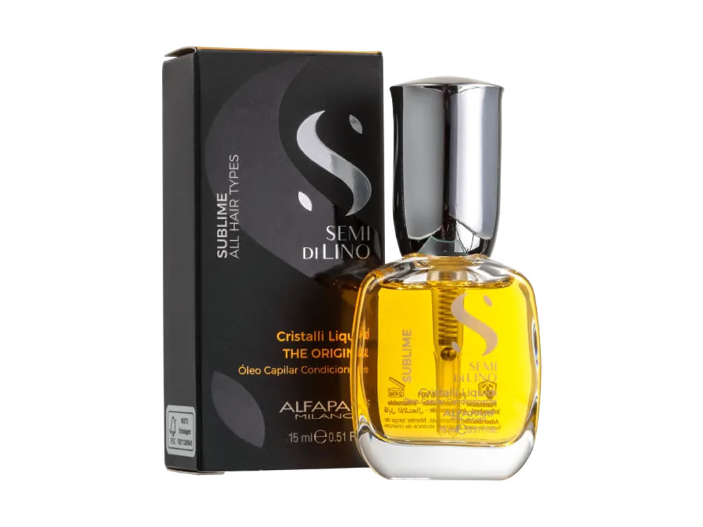 Óleo condicionante para todos os tipos de cabelos. Alfaparf Semi Di Lino Sublime Cristalli Liquidi protege e ilumina a fibra capilar com filtro uv e antioxidante.