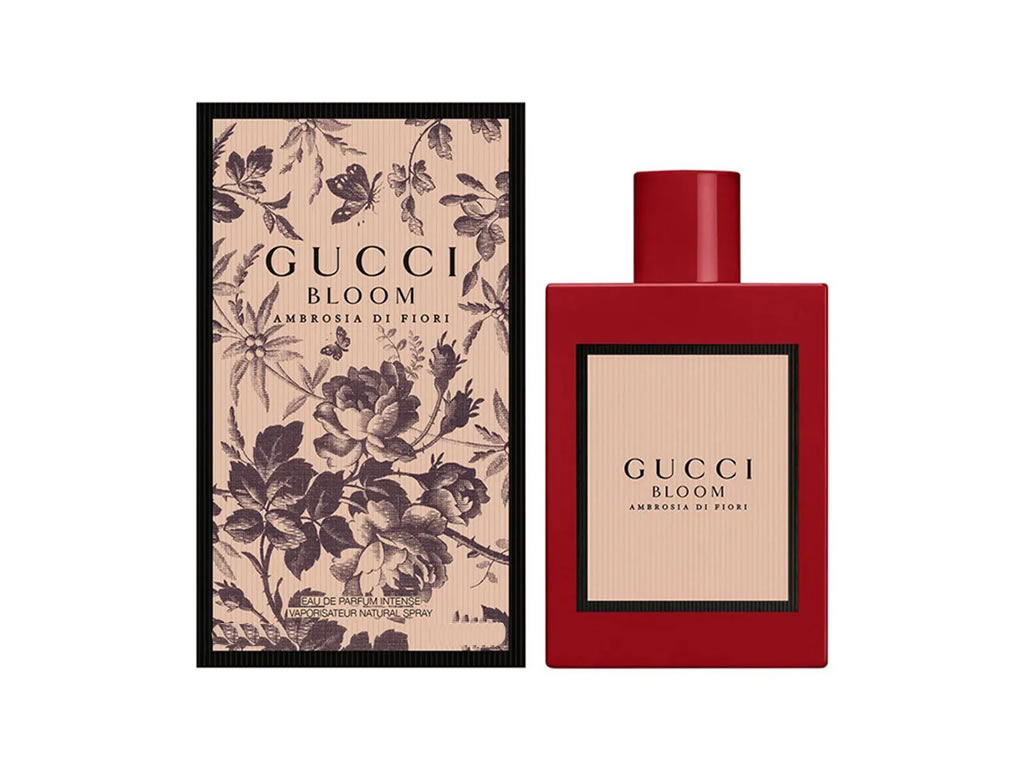Gucci Bloom Ambrosia di fiori resultada da recriação de Gucci Bloom eau de parfum original com notas de flores raras e nobres: jasmim, tuberosa e trepadeira de rangum intensificadas com orris e rosa damascena.