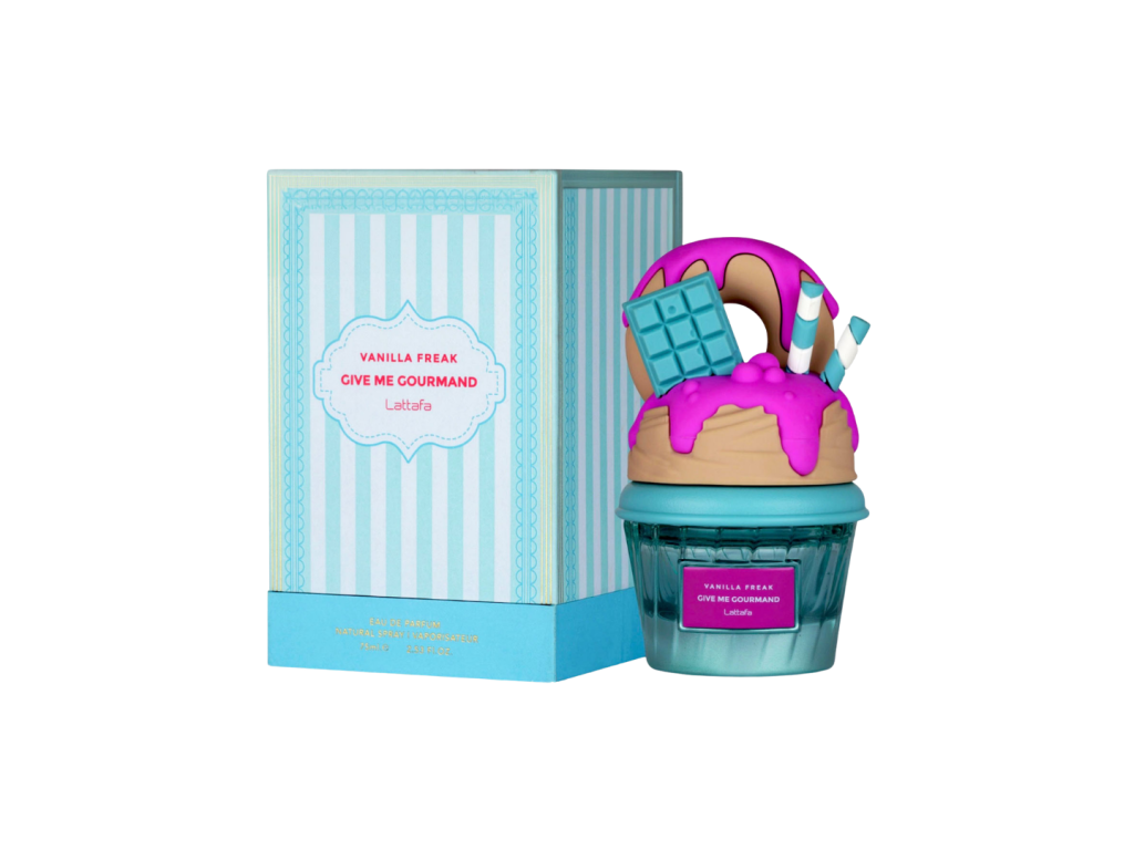 da nova coleção Give Me Gourmand, lançada pela casa árabe Lattafa. Ele está