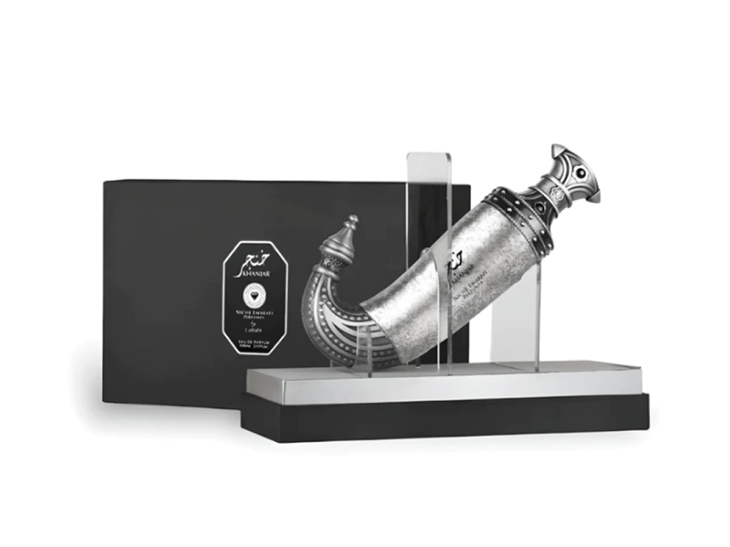 Khanjar Perfume / Eau de Parfum 100ml da Niche Emarati Perfumes (Lattafa) é uma fragrância cativante e complexa que combina elementos picantes, amadeirados e almiscarados para criar uma experiência olfativa sedutora. Este perfume é adequado tanto para homens como para mulheres.
