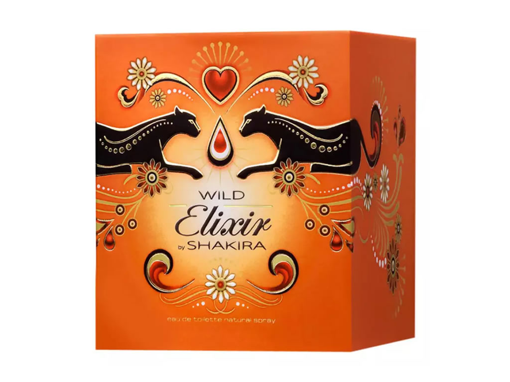 Oriental floral, o perfume revela o contraste entre força e feminilidade, luxo exótico e sensualidade atraente. O Wild Elixir by Shakira teve seu frasco concebido pela artista colombiana Catalina Estrada, que usou o ar selvagem da savana africana para traduzir em design o espírito da fragrância.