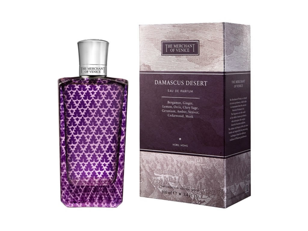 A fragrância Deserto de Damasco é apresentada em um elegante frasco de vidro com padrão roxo, que evoca a antiga tradição têxtil de Veneza. Seu formato retangular estilizado, aliado ao tom roxo masculino, combina com a masculinidade e a ousadia de uma originalidade fascinante. A tampa prateada exibe a rosa dos ventos.