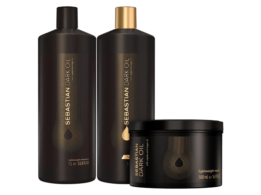 Kit Sebastian Professional Dark Oil Salon Trio conta com fórmulas enriquecidas por um blend de óleos nutritivos e emolientes que reparam de dentro para fora do fio. Deixam os fios mais encorpados, porém leves, extremamente maleáveis e muito brilhantes.