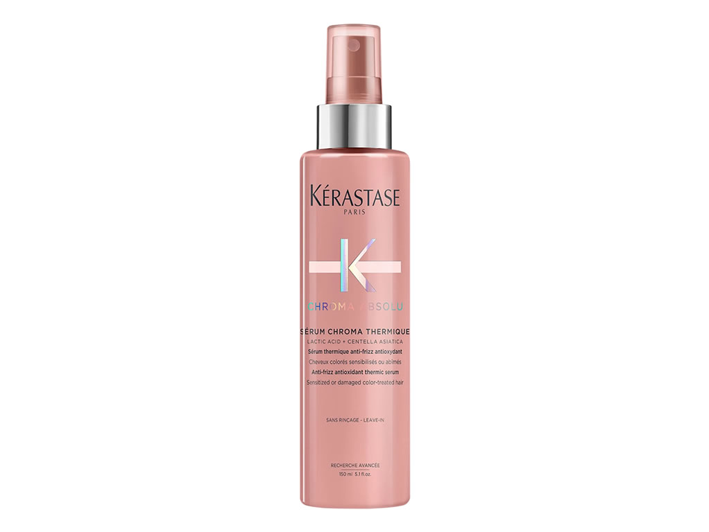 Sérum para cabelos com coloração. Kérastase Chroma Absolu Thermique Hair promove ação térmica antioxidade e antifrizz nos fios. Possui uma textura fluida branca, como um leave-in, com poderosos ativos antioxidantes.