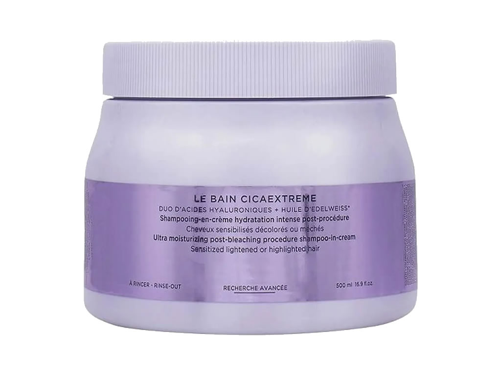 Shampoo Kérastase Blond Absolu Bain Cicaextreme é enriquecido com ácido hialurônico e óleo de edelweiss, que proporcionam cabelos macios, hidratados e com brilho, além de mais fortes e resistentes à quebra. Ideal para cuidar de cabelos descoloridos e sensibilizados.
