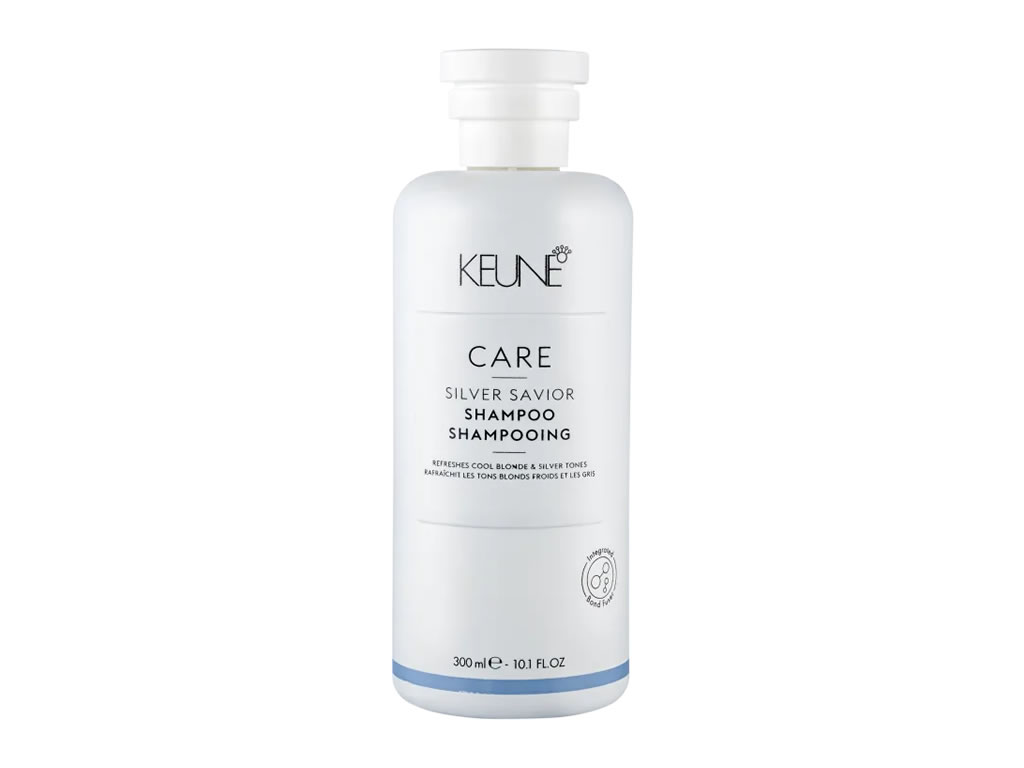 Shampoo desamarelador para cabelos loiros, com mechas ou grisalhos. Keune Care Silver Savior Shampoo neutraliza os tons quentes para revelar um fundo platinado bonito.