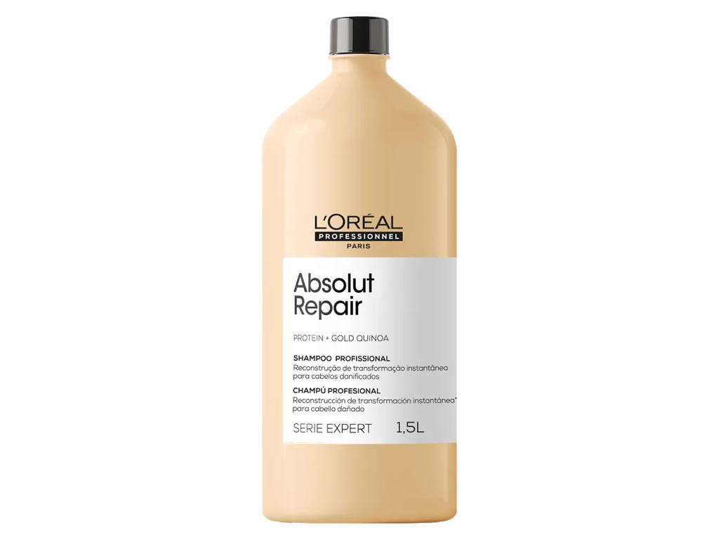 Shampoo para cabelos danificados. L'Oréal Professionnel Serie Expert Absolut Repair Gold Quinoa + Protein Instant Resurfacing reestrutura a fibra capilar, confere brilho e leveza durante a limpeza diária dos fios.O Shampoo Absolut Repair Gold Quinoa + Protein L'Oréal ...