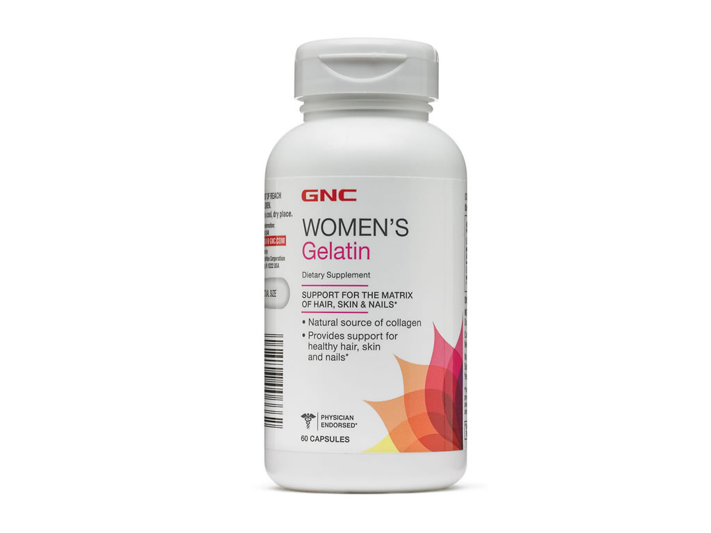 Cápsulas de gelatina GNC: estimulam cabelos, pele e unhas saudáveis *GNC Women's Gelatin contém 12 grãos, ou 778 mg de gelatina em cada cápsula. A gelatina é uma proteína natural que vem de produtos de origem animal ...