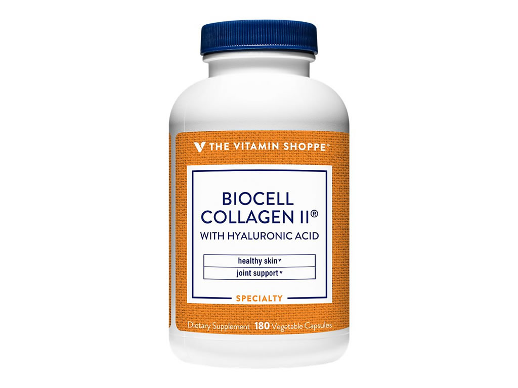 A suplementação com a marca BioCell Collagen II® da The Vitamin Shoppe® é uma maneira fantástica de manter seu brilho jovem e passos elásticos. Estas cápsulas vegetais não transgênicas contêm uma mistura de colágeno hidrolisado tipo II, sulfato de condroitina e ácido hialurônico para promover a saúde da pele e das articulações.