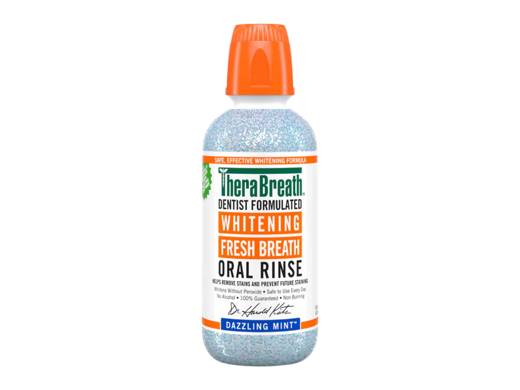 uma barreira protetora que previne futuras manchas. Seguro para uso diário, o enxaguante bucal clareador TheraBreath é formulado sem peróxido, comumente encontrado em muitos produtos clareadores.