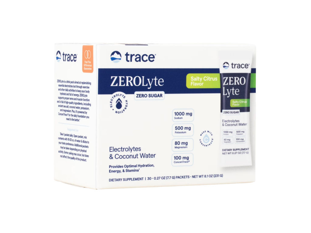 O ZeroLyte Salty Citrus da Trace Minerals é uma mistura de eletrólitos em pó desenvolvida para hidratação profunda, notável pelo seu alto teor de sódio (1.000 mg por porção).